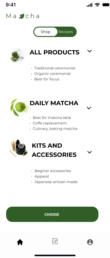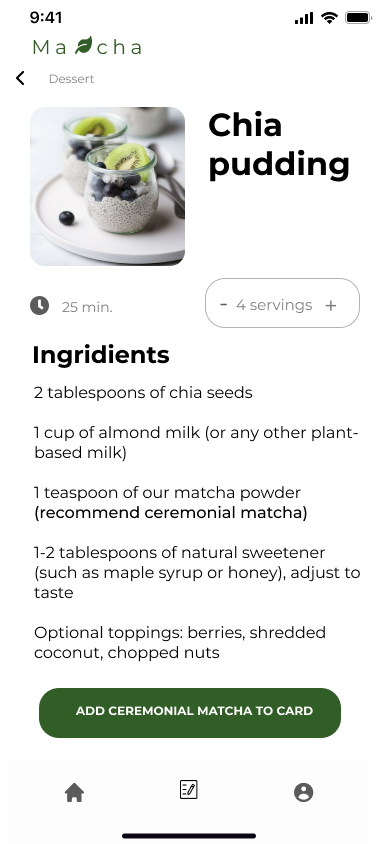 Papildomas appso funkcionalumas yra receptų biblioteka gaminama su matcha. Tam, kad išlaikyti pirkėją ir jis dažniau naudotųsi programėle.